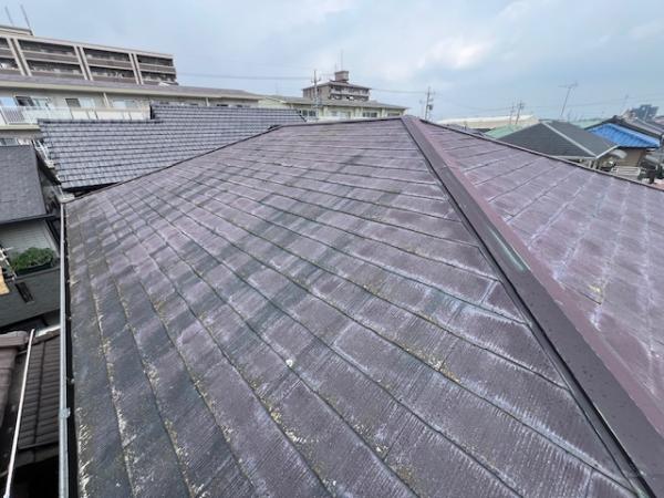 現地調査時は、屋根材の色あせ、クラック、棟板金の浮きが見られました。