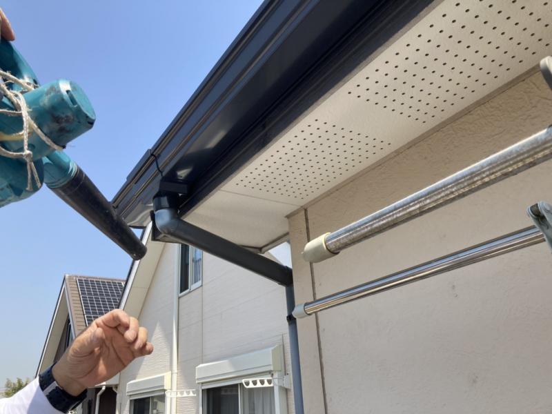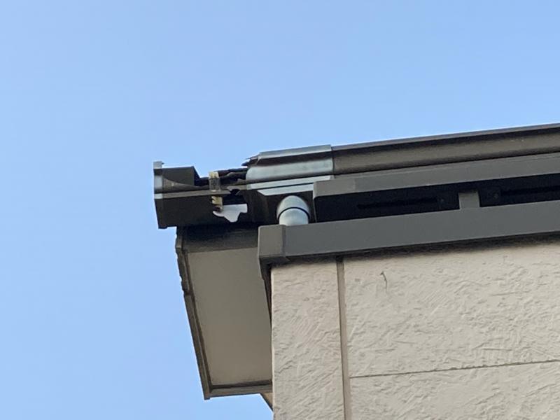 おそらく強風による飛来物で雨樋の集水器とカラーベストの軒先部が破損していました。