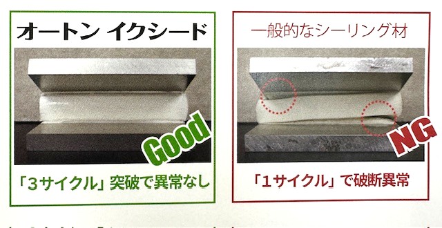 耐ムーブメント力と接着力にこだわり、これまでにない、高耐久性を実現しました。耐久性テストは、過酷な条件を設定し、圧縮率30%↔拡大率30%の伸縮繰返しを4000回、さらに同じ条件を3サイクル=12000回に渡る動的テストを実施。結果は、異常なしでクリア。