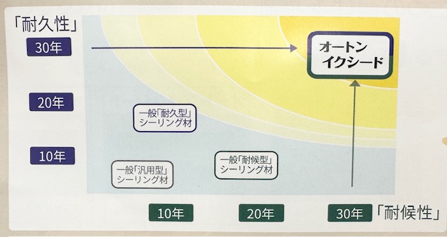 ※イクシードの耐久性及び耐候性30年は、一般的な外壁目地(目地幅10mm、目地深さ8mm)における「期待寿命」です。(保証年数ではありません)