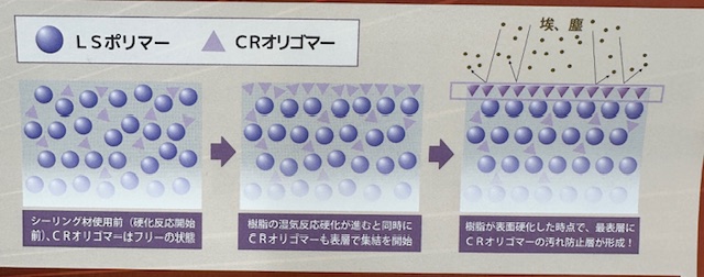 オートンイクシードは、汚れ防止成分CRオリゴマー配合により、硬化初期のベタツキを軽減し、シーリング材の表面への付着を少なくすることに成功しました。(※当社従来品比較)